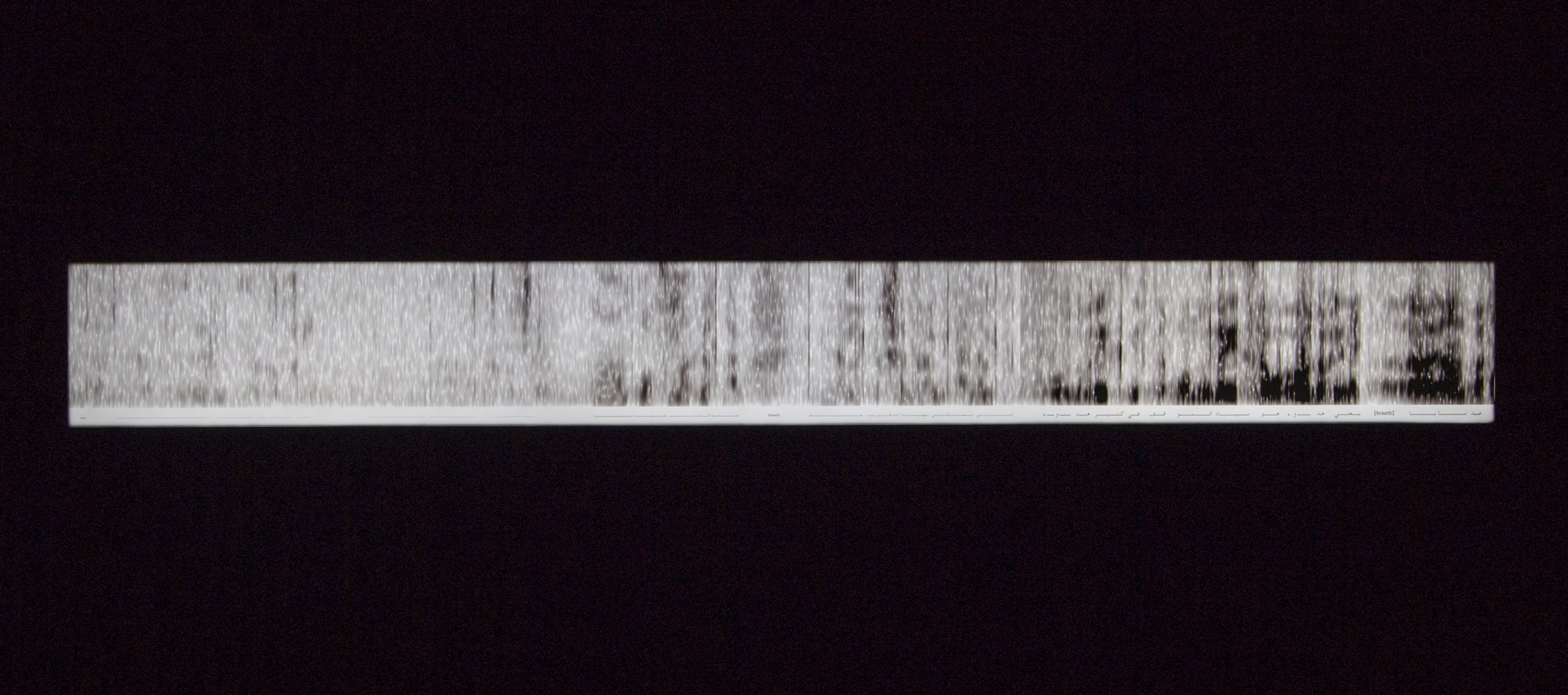 The installation is an automated scenography containing a sound work and a lightbox. The sound piece is played back in a darkened room containing a dimly lit mixing deck/soundboard on which the volume controls are motorized and autonomously move according to the voices one is hearing in the room. The lightbox, which turns on toward the very end of the work, suddenly illuminating the room, documents the ways in which the whispers of inmates became four times quieter after the 2011 protests began: it shows a decreasing sound level, from right to left, of a voice speaking at normal conversational volume, a voice demonstrating the level at which one could speak in Saydnaya before 2011, and finally the level at which one could speak in Saydnaya after 2011.